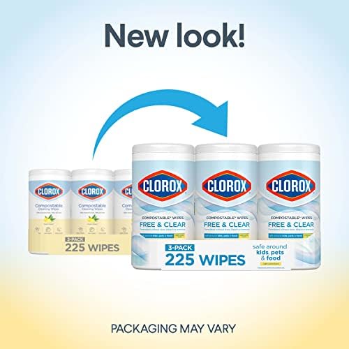 The clear solution for a clean home. Safe around kids, pets and food contact surfaces when used as directed, Clorox Free & Clear Compostable Wipes are formulated without dyes, bleach or ammonia yet deliver a powerful clean thats gentle on surfaces. These lemon scented Clorox wipes pick up dirt and compost back into dirt. These compostable wipes are tough on grease and can cut through grime on a variety of hard surfaces like acrylic, sealed fiberglass, sealed granite, finished hardwood and vinyl. The perfect addition to your household cleaning supplies, Clorox Compostable Wipes meet the US EPAs Safer Choice safer product standards. and made from plant based fibers that are compostable under home conditions only*. Grab these easy, accessible cleaning wipes for everyday cleanups and tough messes.*For home composting: Do not compost wipes if used to clean non compostable messes, such as human or animal waste. Wipes should generally be no more than 10% of total home compost pile. **When used as directed