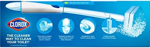 Clorox ToiletWand Disposable Toilet Cleaning System is a convenient way to a quick clean toilet. The starter kit contains one wand, 6 refills and 1 storage caddy to get you started on a deeper clean. Each disposable head is preloaded with Clorox Cleaner with 4x the powerful scrubbing action to clean tough stains, kill germs, remove rust, calcium and limescale while it disinfects and deodorizes with ease. Based on comparative lab tests, the toilet wand cleans better than a brush. The sponge like cleaning head is shaped so that you can get into every nook and cranny needing cleaning and germ control while killing 99.9% of germs like staphylococcus aureus, salmonella enterica, rhinovirus type 37 and influenza A. This all in one system is designed so that you get a brand new cleaning sponge every time you clean without having to touch a yucky brush. Just click your way to a cleaner toilet with the Clorox ToiletWand Disposable Toilet Cleaning Starter Kit.