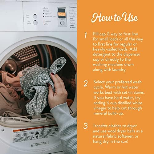 WHAT’S INCLUDED: One 50 oz bottle of Liquid Laundry Detergent with easy and convenient measuring cap. Our eco-friendly, sustainable detergent is capable of deep cleaning 100 loads of laundry. Fill cap 1/2 way to first line for small loads and all the way to first line for regular or heavily-soiled loads and run on your preferred wash cycle.