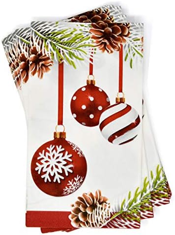 Christmas Guest Napkins: Gift Boutique Christmas guest napkins includes 100 dinner napkins featuring elegant hanging red and white ornament balls with pine leaves and pine cones on a white background with a red border on bottom! High Quality: Napkins are made of high quality thick paper and are soft and absorbent. Great for a Christmas themed party. The vibrant colors of the napkins really add dimension to your parties as your guests will love the pretty design. Enough For Your Guests: Stock up with this set of Christmas guest napkins to make sure you have enough for any Christmas party or event. Ideal for adults, teens, boys and girls for dinner table placement, office, party decor, powder room, bathroom vanity, and kitchen counter top, guest bathrooms and holiday celebrations. More Time To Enjoy: Disposable paper reduces clean-up time so you can enjoy more time with friends and family during the holiday season. After the party just collect the tablecloths with all the garbage and throw it into the trash can. Presto! Cleanup completed! Dimensions: Napkins are 3-ply and measure 7.5″ x 4.25″ folded and 15″ x 12.75″ unfolded.