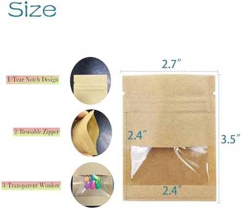 Small Paper Bags Size: 100pcs resealable bags; Out size: 7x9cm(2.7×3.5″), inner size 6x6cm(2.4×2.4″) ; Thickness: 12C thick(single side)
