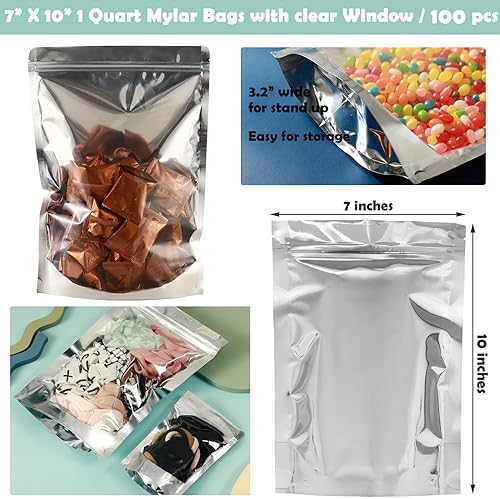 Product name Mylar bags, resealable bags for food, ziplock bags, aluminum foil bags Quantity 100-pack/ 150-pack Measurement 4″x6″, 4.7″x8″, 6″x8.7″, 7.1″x10″ (1 Quart), 8″x 11.8 “, 14” x 10″(1 Gallon) Color Clear and silver grey Features Stand-up, resealable, reusable, waterproof, dustproof, smell proof Great for Nuts, dried fruits, candies, cookies, beans, grains, snack, jewelries, and small items. Help grow your business.