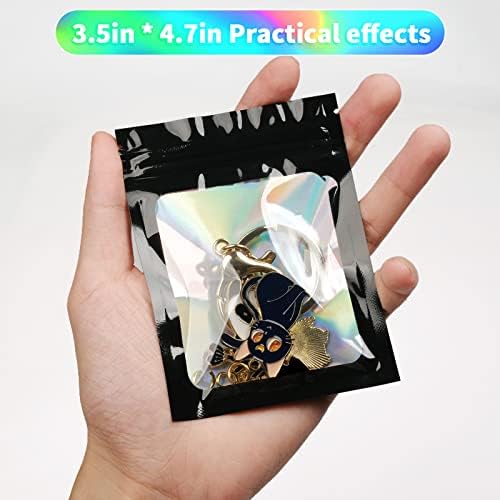 100 pack mylar bags holographic smell proof packaging bag for small bussiness resealable zipper sealable pouch bags sample, jewelry, lipgloss, food,soap,electronic supplies(3.5×4.7 inch,black)
