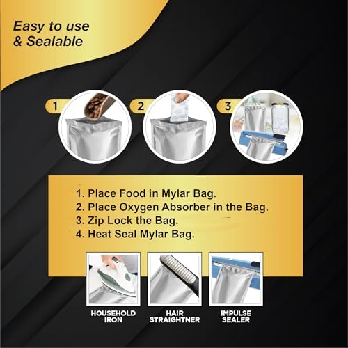 Convenient to Use: Large mylar bags with a tear notch & an easy-to-close zipper closure keep your food fresh & tasty. Use a zipper closure for short-term storage. For long-term food preservation, use a hair straightener, impulse sealer, or vacuum sealer