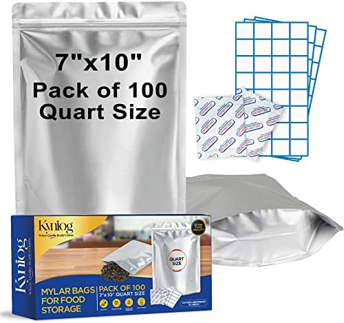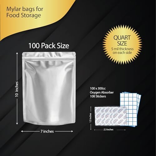 100 Pcs 1 Quart Mylar Bags for Food Storage – 7″x10″ Mylar Vacuum Seal Bags – Ziplock & Air Tight Bags with 10 Mil Thickness-Resealable Mylar Bag-Stand up Pouch with Label Sticker and Oxygen Absorbers