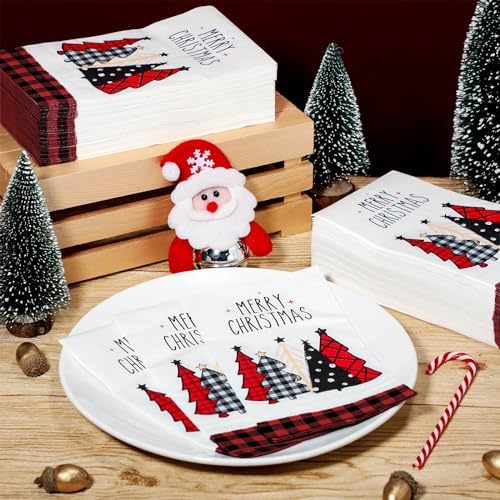 100 Pieces Christmas Napkins Bulk Holiday Disposable Paper Guest Hand Towel Christmas Tree Cocktail Napkins Merry Christmas Hand Napkins for Home Winter Kitchen Xmas Party (Vintage Plaid)