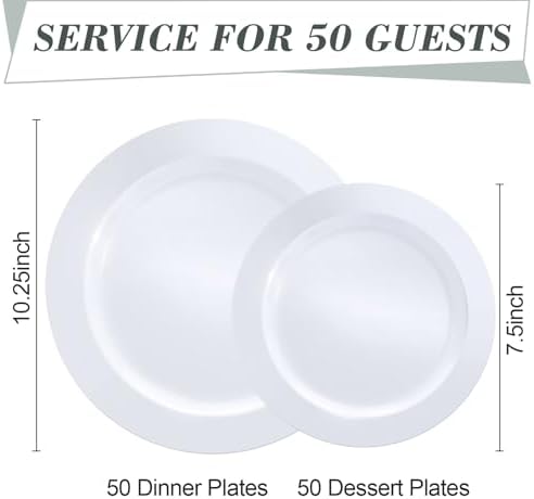 DURABLE DESIGN: These disposable party plates are made from heavy-duty plastic and are perfect for serving party desserts, fruit salads, appetizers, and more. The plate set includes 50 x 10.5″ dinner plates and 50 x 8.25″ dessert plates, serving up to 30 guests. Whether it’s a simple dinner or an elegant dessert, these party plates are an ideal choice.