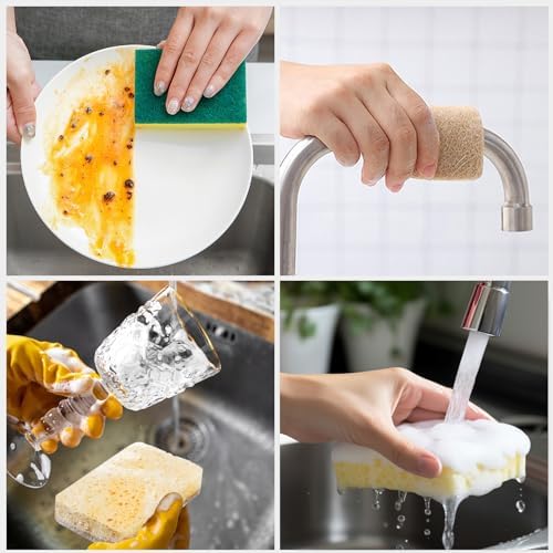 Durable Kitchen Sponge: 2 types material with 2 functions. Soft Sponge is suitbale for cleaning bowls and dishes. Strong water absorption and quick drying. Help reduce odor and bacterial residue. Tough scrubber is very suitable for cleaning pot tough stains.