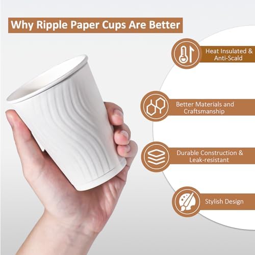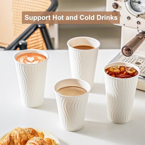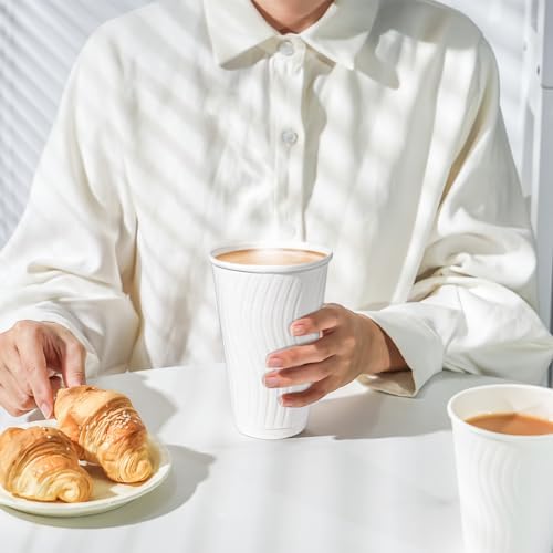 【No Worry of Leakage】12 oz Coffee cups feature a rolled rim for drinking comfort,polyethylene lining reduces condensation buildup, the thick and great padded bottom design that fits the corrugated party cups perfectly and easily stays in place for 24 hours without leaking or seeping, and you can use to go coffee cups multiple times. The 12 oz hot paper cups are ideal for hot/cold beverages, hot chocolate, hot cocoa, coffee, juice, tea, and more.