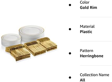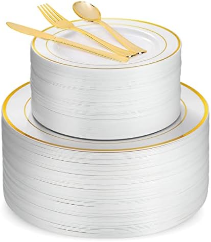 Great combo set to serve 25 guest, 25 large 10.25” dinner plates and 25 small 7.5” salad platesDisposable plastic gold silverware set 25 plastic forks, 25 plastic spoons, 25 plastic knivesIdeal for weddings, receptions, birthday parties, holidays, picnics, catered events and all occasionsMade of durable high quality 100% food grade BPA free non-toxic heavy duty plastic