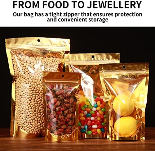 Product name Whether you’re storing food or looking for baggies, our Mylar Resealable Bags offer reliability, versatility, and quality. Quantity 150 pieces of one package Measurement 5×8 Inches;7×11 Inches;7.9×11.8 Inches Color Golden/Clear Features Stand-up, resealable, reusable, waterproof, dustproof, smell proof Great for Nuts, dried fruits, candies, cookies, beans, grains, snack, jewelries, and small items. Help grow your business.
