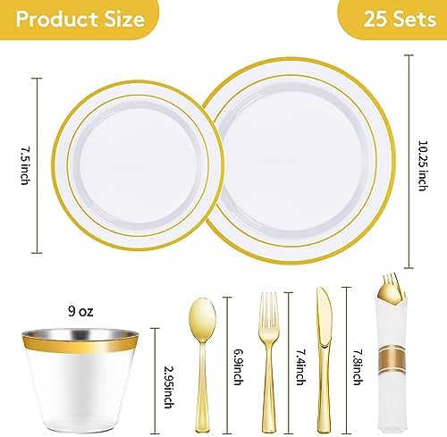 WHAT YOU GET – 175Pcs gold party plates sets for 25 guests with 25 10.25″ dinner plates, 25 7.5″ salad plates, 25 Paper Napkins, 25 9oz cups, 25 knives, 25 forks, and 25 spoons.