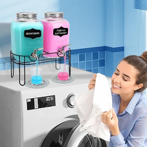 Organize with Elegance: Keep your laundry essentials neatly organized and beautifully displayed. Our dispenser set not only provides ample storage space for up to 2.5 gallons of detergent or fabric softener (total for both jars) but also serves as a stylish decor piece for your laundry room.