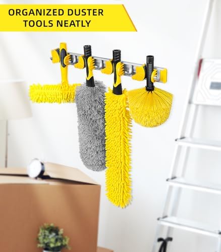 🏠🧹【Universal Joint & Stored Duster Tools】Universal joint can connect a variety of duster brush heads, fits nearly all cleaning accessories: paint roller, fruit picker, light bulb changer,boat stopper,light hanger and more.Freely adjust the angle as needed. And comes with a multi-function wall rack, easy to store the cleaning duster kit neatly to save space