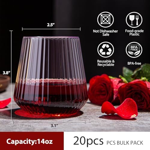 【Stemless Wine Glasses Bulk】Each pack contains 20 PCS plastic disposable wine glasses to accommodate small parties. Save time and energy with quality plastic clear plastic wine glasses so you can enjoy your event without worrying about the mess at the end of the party! Great for parties or individuals.