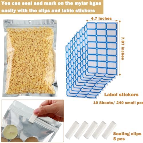 Product name Mylar bags with clear window, resealable bags for food storage, reclosable ziplock pouch bags, aluminum foil bags Quantity 150-pack/ 200-pack Measurement 4×6.2 inches, 4.7×7.9 inches, 5.9×8.7 inches, 7.1×10.2 inches (1 Quart), 10 x 14 inches (1 Gallon) Color Silver grey and clear Features Reusable, reclosable, waterproof, smell proof, dust-proof, damp-proof, air-tight, carriable Great for Nuts, dried fruits, candies, cookies, beans, grains, snack, jewelries, and small items. Help grow your small business.