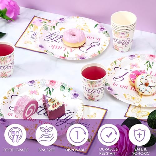 Safe to Use: floral butterfly party tableware set is made of quality paper material, plates and cups are made of cardboard, thick and sturdy, can serve cakes, salad dressings, colas and coffee, etc.; Napkins are made of natural wood pulp, soft and absorbent, suitable for children and adults