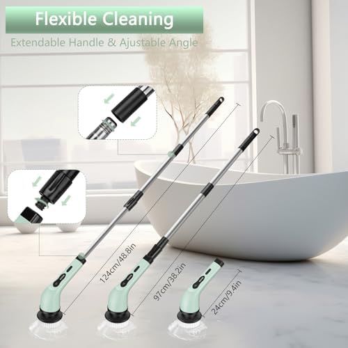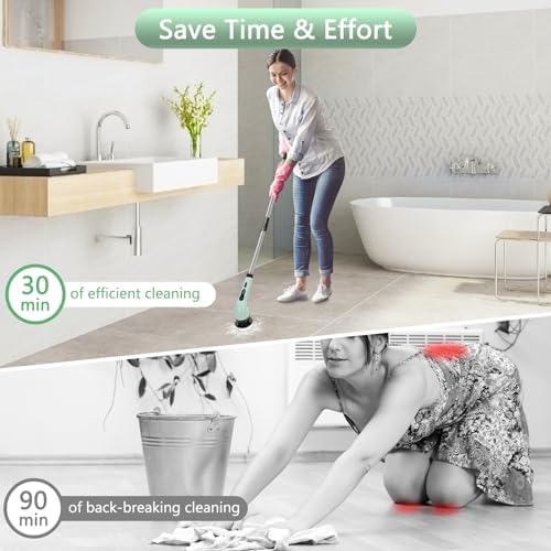 【3 Adjustable Sizes & Cordless】: Cordless shower cleaning brush with 3 adjustable lengths: 9.4″, 24.8″ and 47.3″. Electric Spin Scrubber with an ergonomic design that eliminates the need for bending or kneeling, which is especially helpful for the elderly or those with waist problems. Makes cleaning fast, efficient, and comfortable and you’ll experience smooth, easy every time.