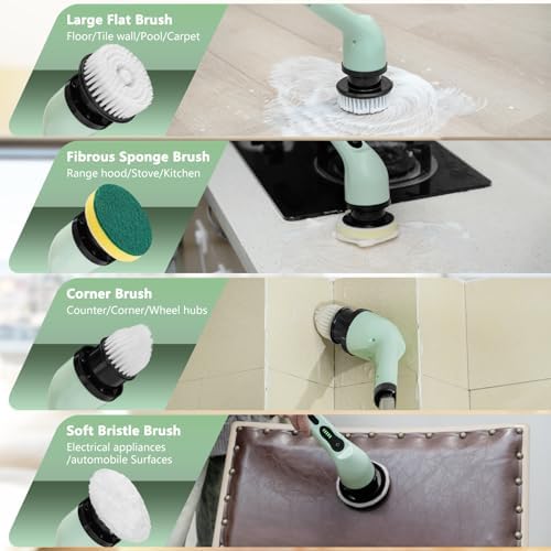 【2 Speeds Control & IPX7 Waterproof 】Cordless Electric Spin Scrubber set has 2 working speeds:Low Speed: 350RPM,High Speed: 420RPM;High power mode can easily remove difficult to clean stains, All you need to do is press the ON/OFF button once,and this brush has strong waterproof properties, you can wash it directly under the faucet. Notice:can not be used under water.