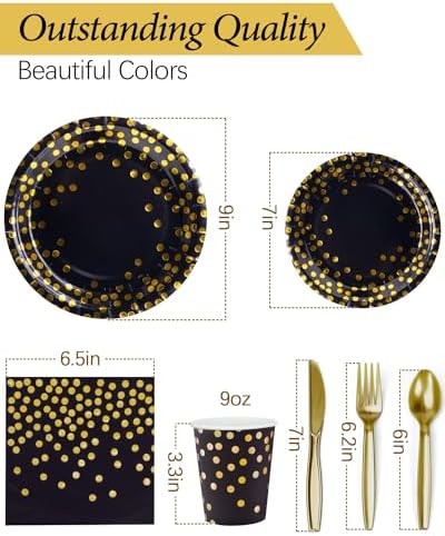 Elevate your next celebration to a new level of opulence with our Black & Gold Prestige Collection. Envision this: You’re the host of a glamorous evening soirée, bathed in the warm glow of twinkling starlight. Your tables are adorned with our exquisite black and gold-themed dinnerware, featuring lavish golden accents against a sleek black backdrop. Your esteemed guests are savoring gourmet delights, sipping from 9oz paper cups, and relishing each bite on our meticulously designed 7″ and 9″ paper plates. Soft, sumptuous napkins are within reach, infusing every moment with an air of sophistication. And the icing on the cake? Cleanup is effortless with our disposable party supplies. Make your event truly unforgettable; choose the Black & Gold Prestige Collection today!