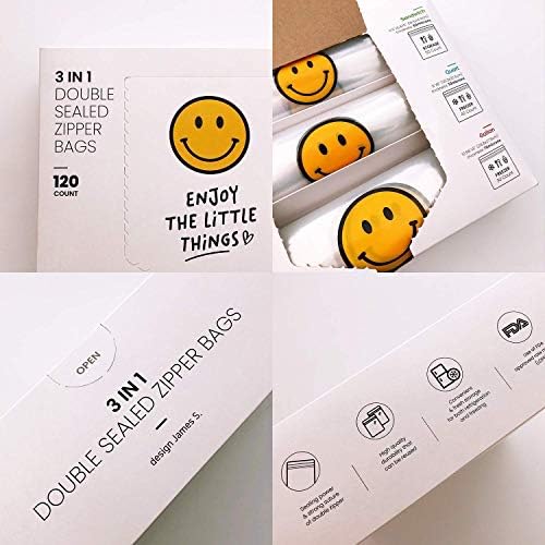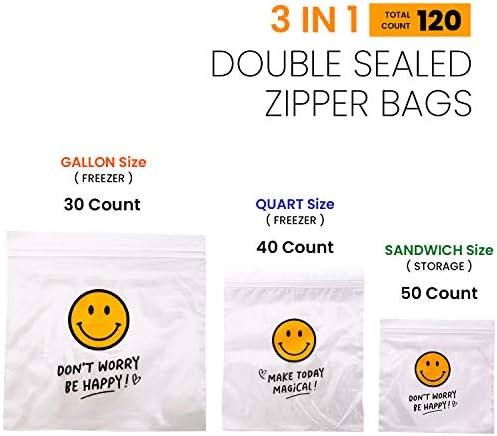 3 in 1 Bulk Double Sealed Reusable Zipper Bags(Total 120 Count) – Storage Sandwich(50 Count) + Freezer Quartz(40 count) + Freezer Gallon Bags(30 count) (Smile)