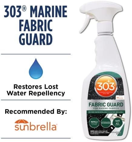303 Fabric Guard is the only product recommended by and for Sunbrella, as well as other fabric manufacturers to restore lost water and stain repellency to fabrics. Resist water, even when you’re on the water. 303 Fabric Guard creates a powerful shield to greatly increase repellency and protect against oil-based stains. Spray it on outdoor leather seats, boat covers, awnings, Dacron sails and even outerwear. When applied to clean and dry fabrics, 303 Fabric Guard restores lost water and stain repellency to straight-from-the-factory levels. Keep all your favorite fabrics crisp and clean for years to come. For the best results, thoroughly clean the fabric with 303 Multi-Surface Cleaner.