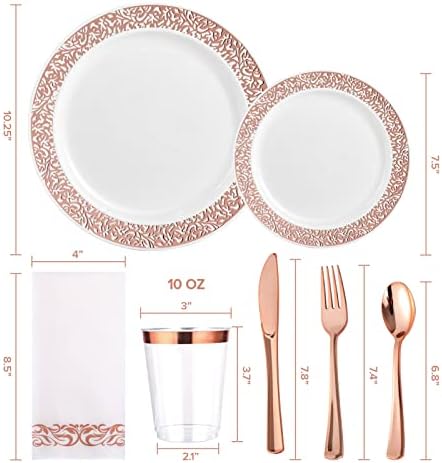 350 Piece Rose Gold Dinnerware Set 50 Guest-100 Rose Gold Lace Plastic Plates-50 Rose Gold Plastic Silverware-50 Plastic Cups-50 Linen Like Paper Napkins,FOCUSLINE Disposable Dinnerware Set