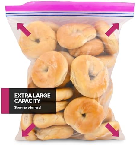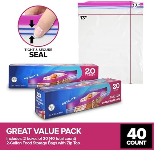 Bulk Quantity: This pack includes 40 convenient 2 Gallon Freezer Bags, providing you with ample storage for freezing food in large quantities. Double Zipper Closure: Designed with a secure double zipper closure, these plastic storage bags offer reliable sealing, helping to preserve the freshness of your frozen items and prevent freezer burn. Extra-Large Capacity: The 2-gallon size makes these freezer bags ideal for storing large portions of food, whether you’re freezing soups, stews, or bulk quantities of fruits and vegetables Easy Dispensing Box: The included easy dispensing box simplifies access to the freezer bags, making it convenient to grab and use them whenever you need to store or organize food in your freezer Resealable and Clear: These two-gallon storage bags are resealable, allowing you to access and reseal them as needed. The clear design lets you easily identify the contents for efficient organization.