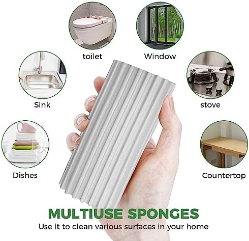 【Easy to Use & Clean】Our 5 pack duster sponge with a dual-sided design .The smooth side of the scrub sponge is suitable for smooth surfaces such as glass, tiles, metal and wooden, while the groove side is equipped with 11 sponge grooves that help scrape off dust particles and hair more easily. The sponge material will quickly dry and harden, effectively preventing bacteria and mildew. When you are done with the sponge duster, simply rinse it off with water and place it in a ventilated place.