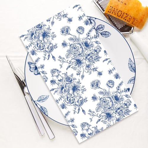 50 Pack Blue Floral Guest Napkins Disposable Blue Flower Paper Napkins 3 Ply Decorative Hand Towels Guest Dinner Napkins for Bridal Shower Baby Shower Wedding Birthday Dinner Party Supplies