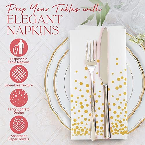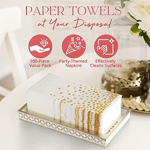 LUXURIOUS DESIGN: The paper hand towels for bathroom have a delicate white design with a beautiful dotted gold print. The napkins have a luxurious linen-like feel while also being disposable.