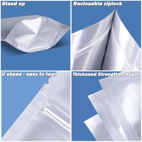 Product name Mylar bags stand up, resealable bags for food storage, reclosable ziplock pouch bags, aluminum foil bags Quantity 60 and 120 packs Measurement 9.4″x14.6″ (1 Gallon), 7.1″x10.2″ (1 Quart), 4″x6″ (1/2 Pint) Color Silver Features Reusable, reclosable, waterproof, smell proof, dust-proof, damp-proof, air-tight, carriable Great for Nuts, dried fruits, candies, cookies, beans, grains, snack, jewelries, and small items. Help grow your small business.