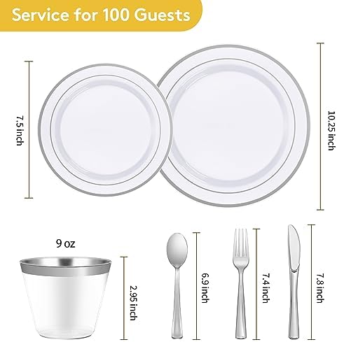WHAT YOU GET – You will receive a 600-piece silver plastic dinnerware set, including 100 10.25″ dinner plates, 100 7.5″ salad plates, 100 9oz cups, 100 knives, 100 forks, and 100 spoons. Additionally, we provide 1-year after-sales support. If you have any questions before or after purchasing, please let us know, and we will respond within 12 hours to solve them for you.