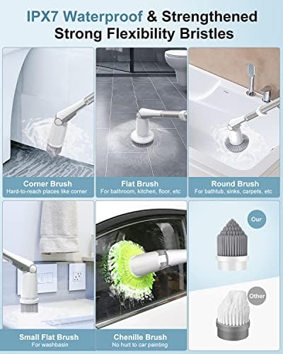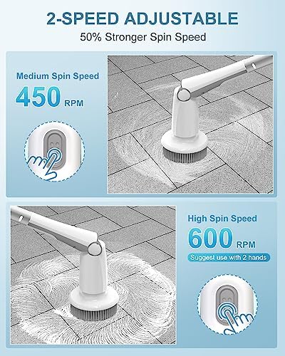❀ [ENHANCED DUAL POWERFUL SPIN SPEEDS]: Equipped with dual powerful 450RPM and 600RPM spin speeds. The 600RPM is used for stubborn stains or very dirty surfaces. You can easily clean your bathroom, bathtub, shower basin, tile floor, crevices, etc. Stay away from the former edition that is of weak power, clean more efficiently! (NOTE: For very stubborn stains, soak with cleaner for 3-5 minutes before the use.)
