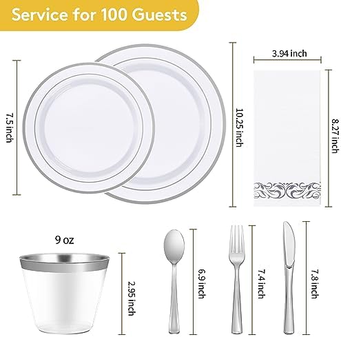 EVERYTHING INCLUDED – 700 piece silver plastic dinnerware set with 100 10.25″ dinner plates, 100 7.5″ salad plates, 100 Paper Napkins, 100 9oz cups, 100 knives, 100 forks, and 100 spoons. Additionally, we provide 1-year after-sales support. If you have any questions before or after purchasing, please let us know, and we will respond within 12 hours to solve them for you.
