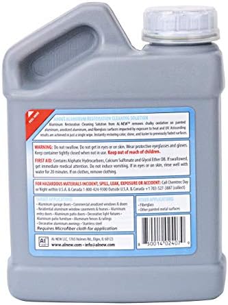 AL-NEW Aluminum Restoration Cleaning Solution restores your vast array of aluminum or anodized aluminum substrates back to their original shine, luster, and color. There is no need for expensive buffing or re-finishing, and depending on sun exposure, the treated product can maintain its newly restored clarity, shine, and water-repellency for up to a full year.