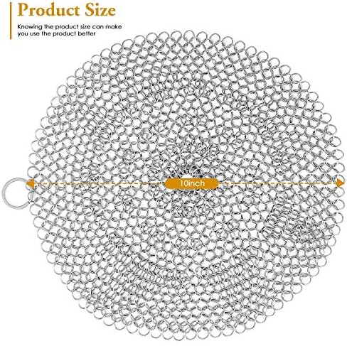 SMOOTH & DURABLE: Premium 316 stainless steel cast iron cleaner in dimension of 10 inch diameter with classic smooth chainmail rings and manually closed rings interface allows gentle safe treatment of cast iron pans, paste pot, cups, dishes ect. It is ideal for cleaning all your cast iron cookwares, such as cast iron pans , pre seasoned cast iron , skillets, dutch ovens , camp chef griddles , waffle irons and so on.