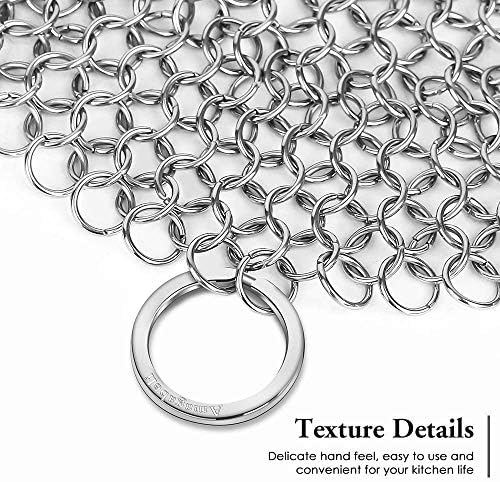 Amagabeli 316 Stainless Steel Round Cast Iron Cleaner Specifications: Color: Silver Size: 8 inch Diameter Mateiral: 316 stainless steel Interface: Manually closed Series: 2nd generation round chainmail series 4 Series for you to choose: Classic series with classic rings 2nd generations round chainmail series Upgraded series with pan scraper Luxury series with smaller soldered rings; Items include 1 XL 8”x6” cast iron cleaner and 2 polycarbonate pan scrapers. The iron cast cleaner is designed with premium grade 316L rustproof stainless steel. It is durable and smooth enough for cleaning your pan without damaging the seasoning. The 2 pan scrapers are designed for further cleaning and protecting your pan’s seasoning. Heat resistant to 275°F.