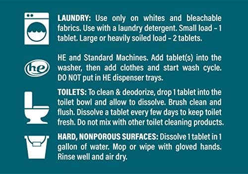 TOILET: Use as a bathroom and toilet cleaner to clean and deodorize. Dissolve in toilet bowl, brush clean and flush. Use bleach tablets for toilet tank – dissolve tab every few days