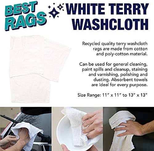 DURABLE CLEANING SUPPLIES: These white terry cloth rags are discarded as irregulars during the washcloth production process. Use them around the home to clean up spills, grease, grime, and oil. Remove dirt from tools, paint from brushes, and to detail cars. These bulk terry towel cleaning rags are hearty and will not let you down.