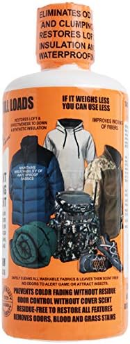 Sport-wash residue free detergent is safe for all washable fabrics, and yet powerful enough to remove odors and your toughest stains such as soil, blood, and grass. Its secret is that unlike other detergents designed to leave Brighteners, fragrances, and other residue behind, Sport-Wash rinses completely. Nothing is left on your clothing to clog the pores of your fabric. Cotton, wool, and synthetic materials are left completely clean. Insulation like down, Thinsulate, and hollofil fluff up for maximum warmth. And even difficult to clean Sportswear materials such as Gore-Tex have their waterproofing and breathability restored.