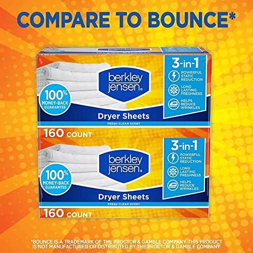 Berkley Jensen Soft and Fresh Dryer Sheets, 320 ct. Berkley Jensen fresh scent fabric sheets reduces wrinkles. Using Berkley Jensen’s powerful static reduction technology helps reduce cling. These dryer sheets are guaranteed to leave your clothes smelling fresh every time. Product Features: Helps fight static cling Reduces wrinkles Keeps your clothes smelling fresh longer Replaces fabric scratchiness with softness For use in all types of dryers including HE and regular Bounce’s signature Outdoor Fresh scent Includes 2 packs of 160 dryer sheets