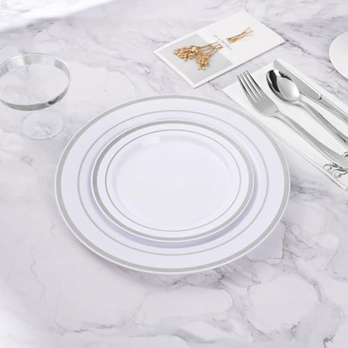 ELEGANT DESIGN FOR VERSATILE OCCASIONS – With its sliver rim and elegant white base, this plastic plate effortlessly fits any occasion, from vibrant parties and elegant weddings to casual gatherings. Despite its plastic composition, these party supplies radiate the sophistication of ceramic, elevating the event’s allure and making a lasting impact on guests.
