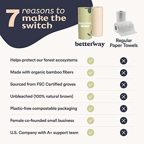 Betterway Bamboo Natural Brown Paper Towels – 8 Rolls, 2 Ply, 110 sheets – Plastic Free, Disposable Kitchen Paper Towels – Select Size, Tree Free, Compostable, Strong & Absorbent – Unbleached, No Dyes