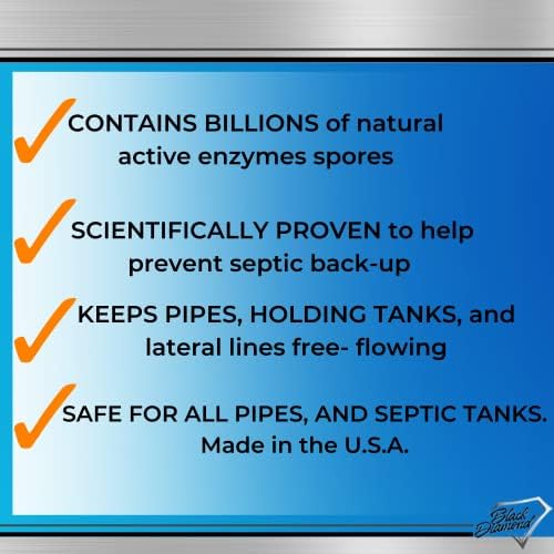 Black Diamond’s “GET SERIOUS” Septic Tank Treatment is a blend of billions, yes billions of spores that will enter the system and colonize the lateral lines and the holding tank and keep them open and functioning. GET SERIOUS Septic Tank Treatment will continually produce enzymes that break down and liquefy suspended solids such as fats, greases, toilet, and other papers, carbohydrates, and proteins. Rotten egg odors (hydrogen sulfide odors) are reduced by these potent bacteria as they liquefy the organic solids and help the effluent flow freely and efficiently into the subsoil. Regular treatment with GET SERIOUS Septic Tank Treatment prevents foul odors, foul gases, unnecessary pumping, excavation bills, embarrassment, complaints from neighbors, ponding drain fields and inoperative dry wells. Septic Tank Challenges — A septic tank’s function is to hold organic waste long enough to allow digestion and liquefaction and to facilitate drainage of this liquid into the subsoil. However, they can overflow, emit foul odors and gases, and cause backups of sewage into plumbing fixtures, clog drain field pores, plug drain field soil, and cause unnecessary pumping and excavation bills. USAGE: Proper maintenance should begin with a SHOCK treatment of 32 oz for up to a 1500-gallon tank. Monthly preventative maintenance: Pour 8 oz. into toilet and flush or sink drain and run water for 1 min. If the septic tank is clogged and odorous, add 32 oz directly to the septic tank through the access hole. After the tank begins functioning properly, start a preventive maintenance schedule.