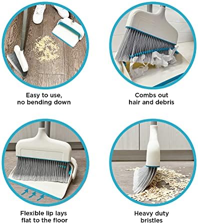 Self Cleaning Comb Design – Sturdy teeth at the top of the dustpan comb the broom, when it collects hair/dust/lint which usually gets tangled into the bristles. Otherwise, you would need to remove them manually – not the most pleasant experience. The dustpan has a rubber lip and seamlessly sticks to the floor. It picks up everything, including the smallest particles, in the first swoop, so you will finally spend less time cleaning – more time living!