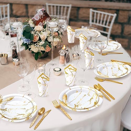 Elegant Marble Design: the party plates sets for 50 guests feature a modern white and gold marble design and are matched well with golden forks, spoons and knives that add an elegant sense to most events; Whether it’s a wedding, birthday party, or special dinner, our dinnerware set will leave deep impression on your guests and elevate the overall ambiance