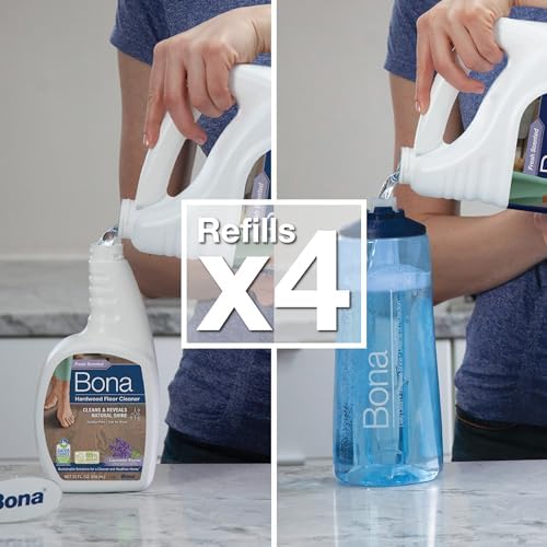 Bona Hardwood Floor Cleaner Refill fills your empty Bona cartridge or spray bottle with ready-to-use Bona Hardwood Floor Cleaner. The bottle has splashless technology while the wide handle allows for an easy, controllable refill experience. The residue-free, fast drying solution cleans wood floors by gently removing dust, dirt and grime to reveal the floor’s natural shine and beauty. Crafted with plant-derived ingredients and containing 95% USDA certified biobased content for a more sustainable cleaning experience. Available in Lavender Thyme, a blend of lavender, light citrus, pure eucalyptus and herbaceous thyme. Love your floors with Bona. Waterbased solutions & Safer Choice certification ensure a safer product for people, pets, and the planet.