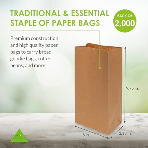 Made by Prime Line Packaging, our brown kraft paper lunch bags are the perfect quality option for deli, bakery, take out, and everyday lunch use. With each bag holding a 4 LB capacity and coming in a bulk pack of 2000, these small sized SOS bags measure 5″ wide by 3.13″ deep by 9.75″ tall, making them the perfect size for holding small sandwiches, bread, pastries, cookies, candy, nuts or coffee beans, treats and snacks, or small takeout needs for delis, bakeries, restaurants, coffee shops, cafeterias, or individual use. Our kraft paper bags can also be used as party favor bags and treat bags, as well as a resourceful option for merchandise bags for small items like jewelry. Each bag is constructed with a squared bottom for easy standup while loading and unloading. For the creative spirit or the small business owner, these bags can be customized in a variety of ways, serving as a blank canvas to embellish with your businesses’ logo, or tailor to your own liking with stickers, markers, paints, stamps and more. Kraft paper sandwich bags can serve as the perfect party favor bags or disposable food service bags alike, and are a popular choice amongst delis, bakeries, restaurants, small businesses, boutiques, and individuals. Each brown sack is versatile enough to rise to the occasion for many needs, from disposable lunch bags to food service industry bags to party favor, small customer purchase, and take-out order bags. Regardless of your needs, the design of these bags and their durable 4 LB capacity brings a variety of uses to a traditional staple of paper bags.