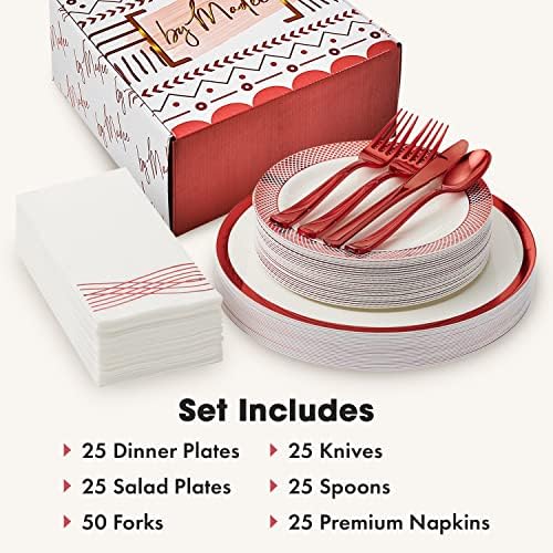 By Madee Red Plastic Plates | Disposable Dinnerware 175 PCS for 25 Guests | Dinner Plates, Salad Plates, Silverware & Linen-Feel Napkins | Premium Disposable Plates for Party | Heavyweight